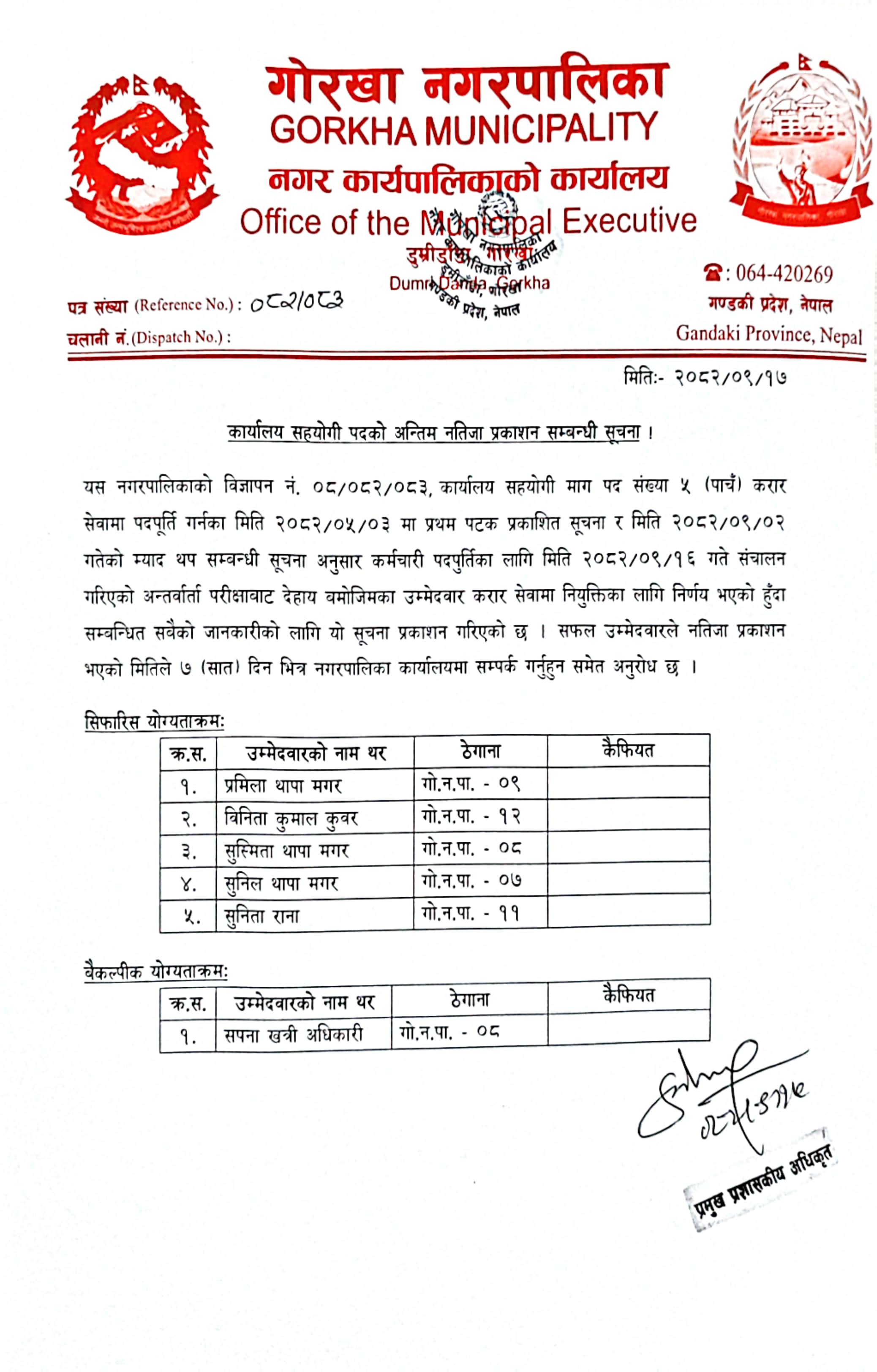 कार्यालय सहयोगी पदको अन्तिम नतिजा प्रकाशन सम्बन्धी सूचना