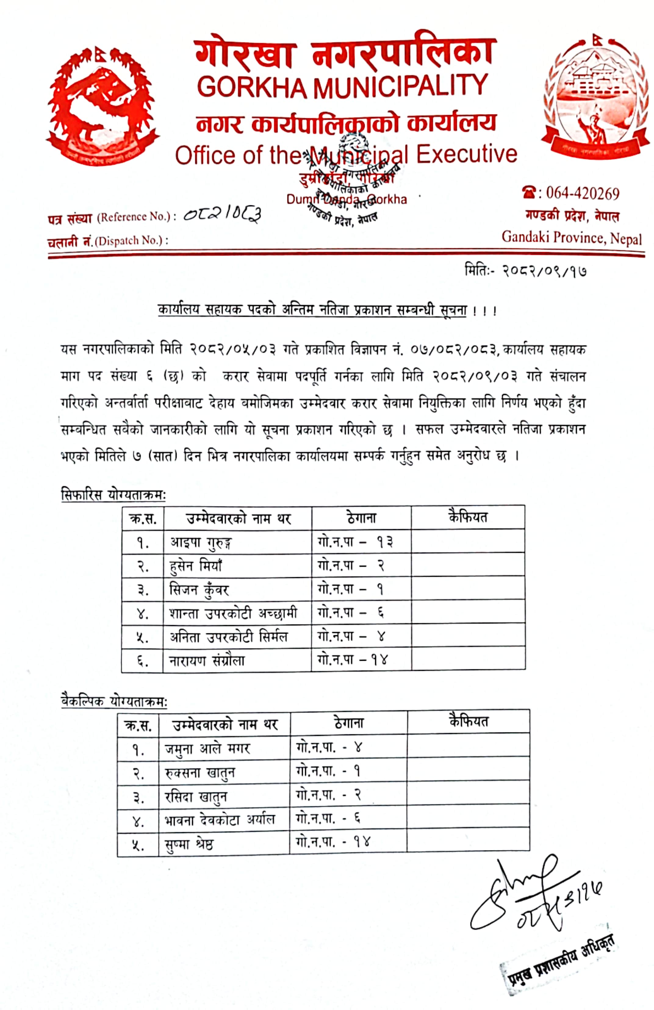 कार्यालय सहायक पदको अन्तिम नतिजा प्रकाशन सम्बन्धी सूचना